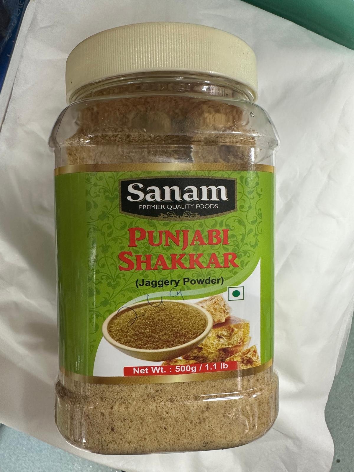 This is a 500g (1.1 lb) jar of Sanam Punjabi Shakkar, which is jaggery in a powdered form. Produced by Sanam Premium Quality Foods, this product is an unrefined sweetener with a rich, natural flavor, making it a convenient alternative to solid jaggery for various cooking and baking applications.